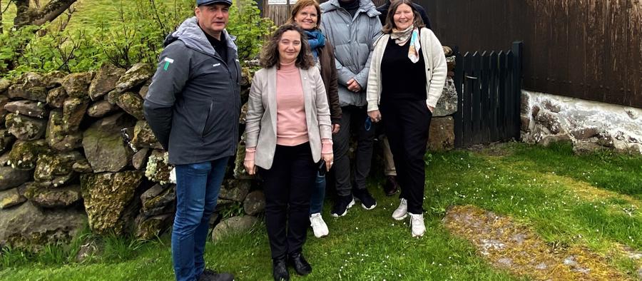 Mynd frá útisavninum Hoyvíksgarði í Kúrdali. Herleif Hammer, stjóri á Tjóðsavninum, Sirið Stenberg, landsstýriskvinna, Sanna Hansen, fíggjar- og fyrisitingarleiðari á Tjóðsavninum, Torkil V. Rasmussen, deildarstjóri á mentanardeildin í Almanna- og mentamálaráðnum, Eyðun Mohr Hansen, aðalstjóri í Almanna- og mentamálaráðnum og Armgarð Weihe, fulltrúi í Almanna- og mentamálaráðnum.